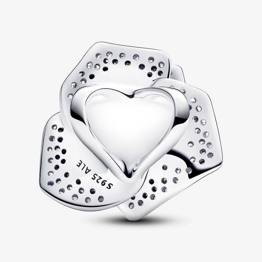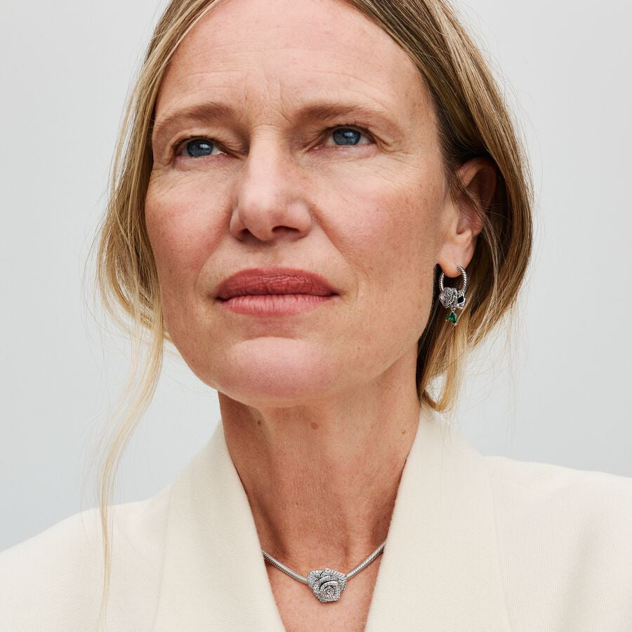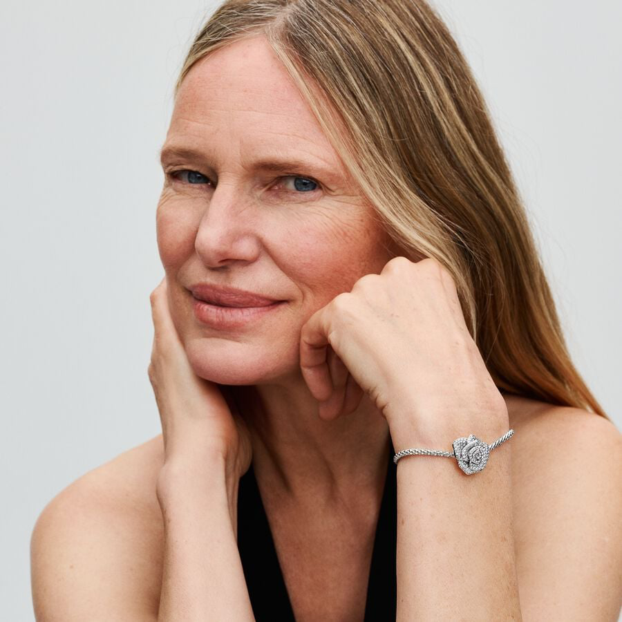 Embrace the floral elegance of our Sparkling Rose in Bloom Charm, a symbolic piece crafted in sterling silver. Intricately designed to capture the delicate nature of the flower, the charm showcases a layered petal effect that reflects the beauty of a blooming rose, adorned with sparkling pavé. Adding lifelike detail and movement, two green stones dangle beneath the flower to represent leaves. Perfect as a gesture of love for someone special or as a meaningful addition to your collection, this charm is sure to keep the romance alive.