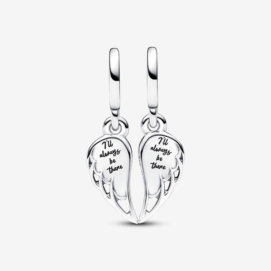 Our Splittable Angel Wings Charm brings forth inspiration and upliftment. Crafted for companionship, these charms in sterling silver serve as a heartfelt homage to your cherished guardians. Adorned with shimmering clear cubic zirconia and celestial blue synthetic crystals, this charm of angelic wings showcases the heartfelt inscription "I'll always be there" engraved on the reverse of each wing. One for yourself and one for a beloved, don these dangling charms to pay homage to those who hold significant importance in your life.