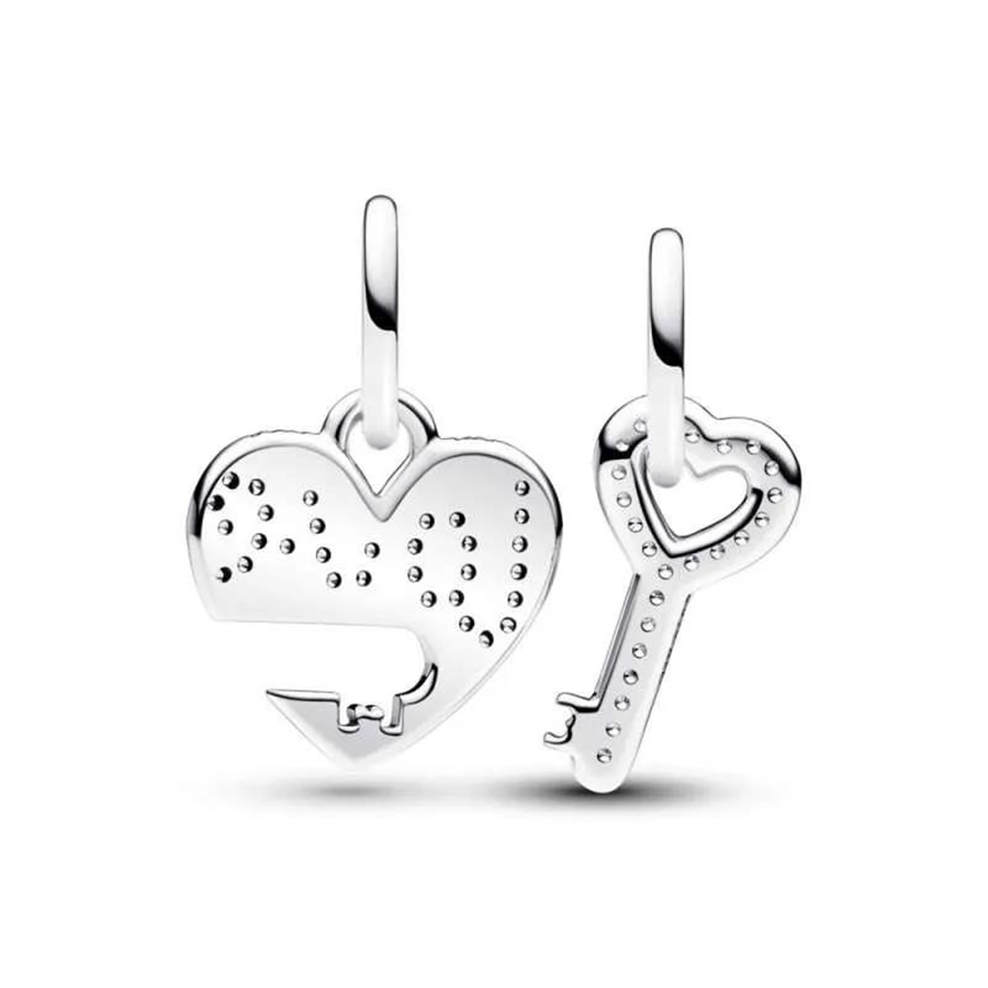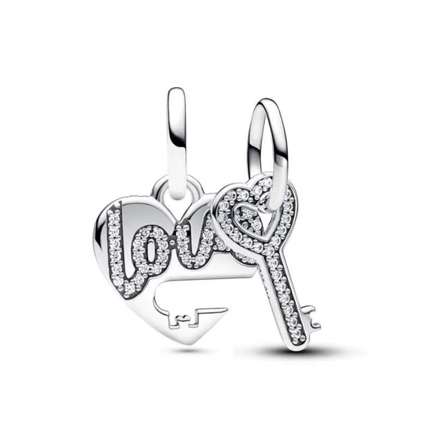 Discover affection with the Splittable Heart & Key Love Charm. This dual-part charm features a glistening pavé key dangle, seamlessly fitting into the heart-shaped component. Adorned with shimmering stones, the word "Love" graces the heart-shaped disc above the cut-out. Adorn both segments or bestow one upon the individual who possesses the key to your heart.