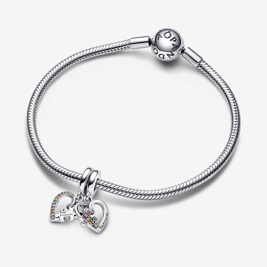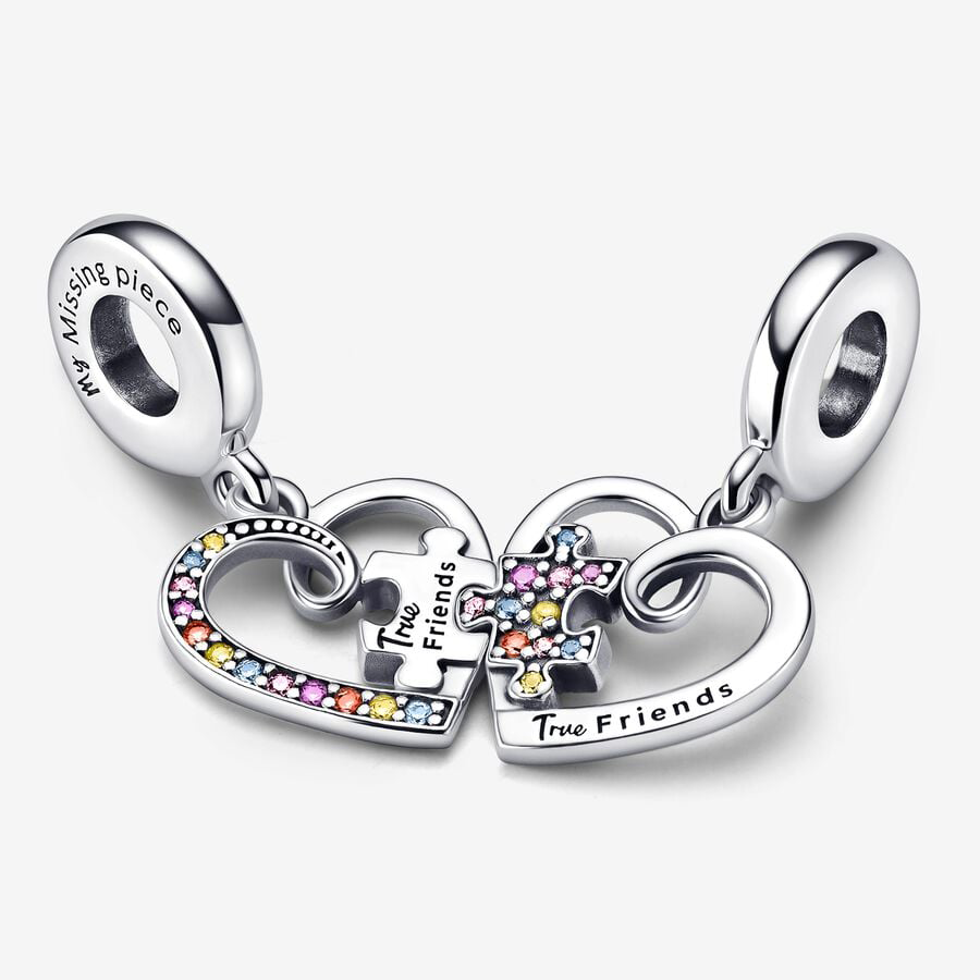 Fashioned from sterling silver, the True Friends Splittable Puzzle Friendship Charm embodies the notion that true friends are essential to our completeness. Intended for companionship, it showcases two dangling elements merging a heart-shaped cutout with a puzzle piece, adorned with an assortment of vibrant gemstones on one side. Engraved with the sentiment "My Missing Piece," the clasp encourages you to share one with your closest companion, reuniting the pieces whenever you reunite to forge a deeper bond.