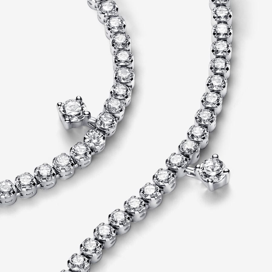 Elevate your holiday season with brilliance. This sterling silver Sparkling Drops Tennis Bracelet features a row of shimmering round brilliant cut cubic zirconia, accented with dangling stones along the chain, perfect for making a statement at any event. Whether worn solo or stacked with bracelets of varied hues and metal textures, it promises a contemporary flair.