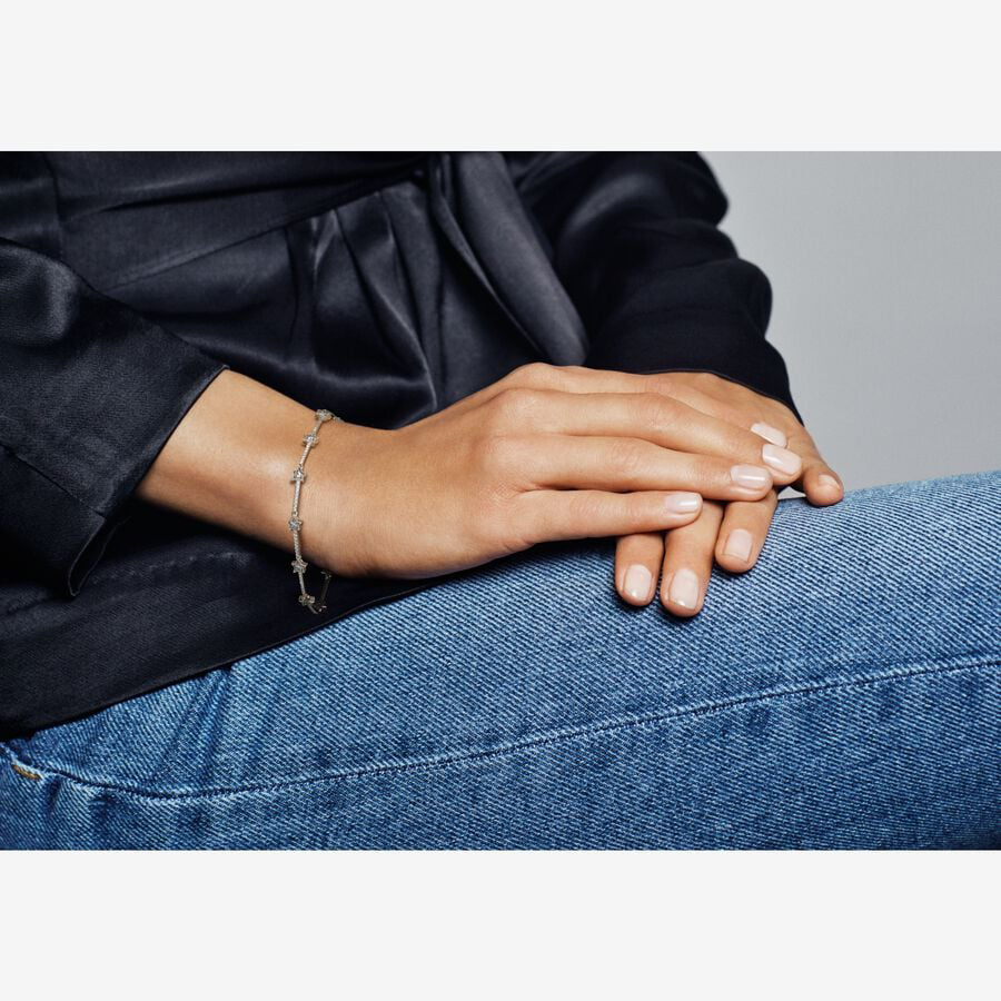 Immerse yourself in our enchanting realm, inspired by the allure of the nocturnal heavens and the luminosity of celestial bodies. Our starry bracelet showcases an array of uniquely shaped silver stars adorned with circular cubic zirconia stones, interconnected by pavé bars, invoking a realm of infinite possibilities. Each star represents a cherished memory or an aspiration yet to be fulfilled, urging you to embrace your journey with pride. Let this sterling silver bracelet serve as a timeless reminder of your remarkable journey.
