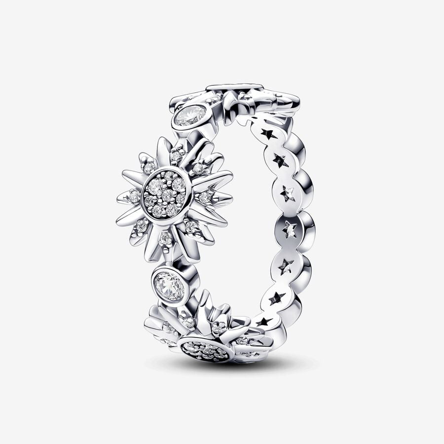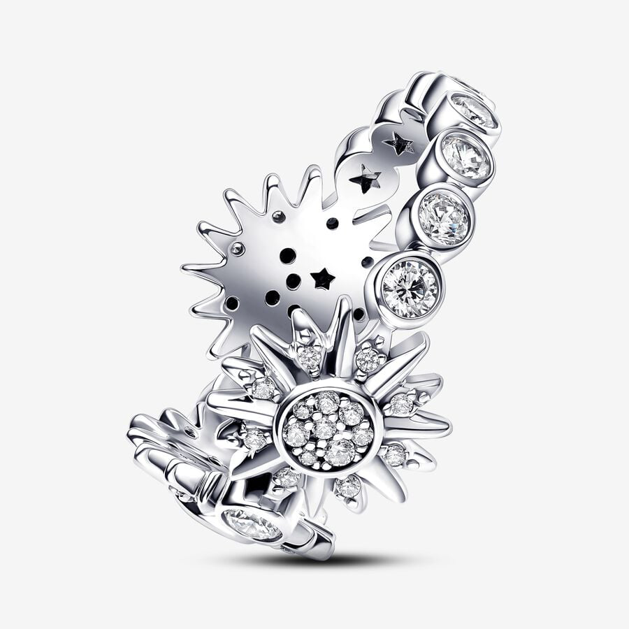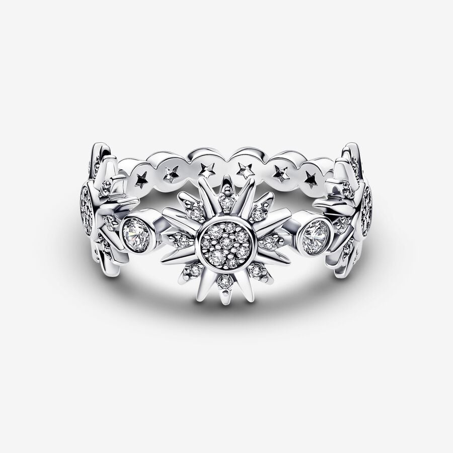 Illuminate each day with the White Triple Sun Ring. This elaborate sterling silver band is adorned with bezel-set stones. Positioned at its core, three suns glisten with pavé, encircled by radiant rays. Half of these rays are polished while the other half glimmer with cubic zirconia stones and microbeads. Drawing inspiration from the resplendent allure of the sun, this ring promises to infuse your appearance and spirit with brightness and optimism.