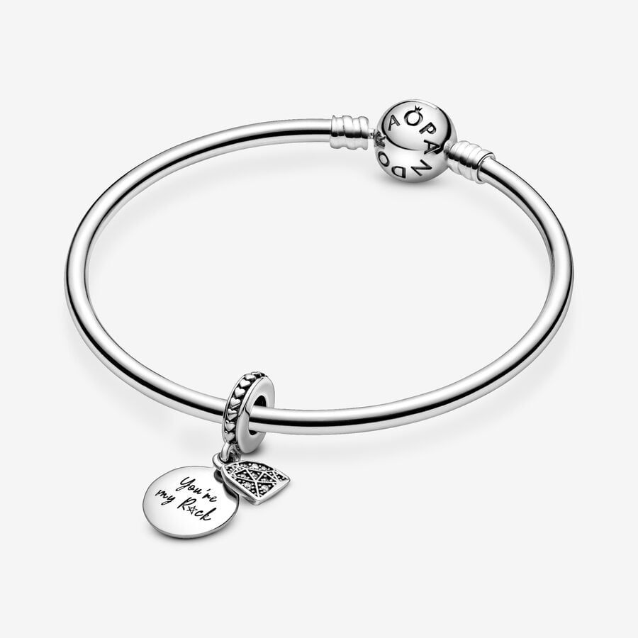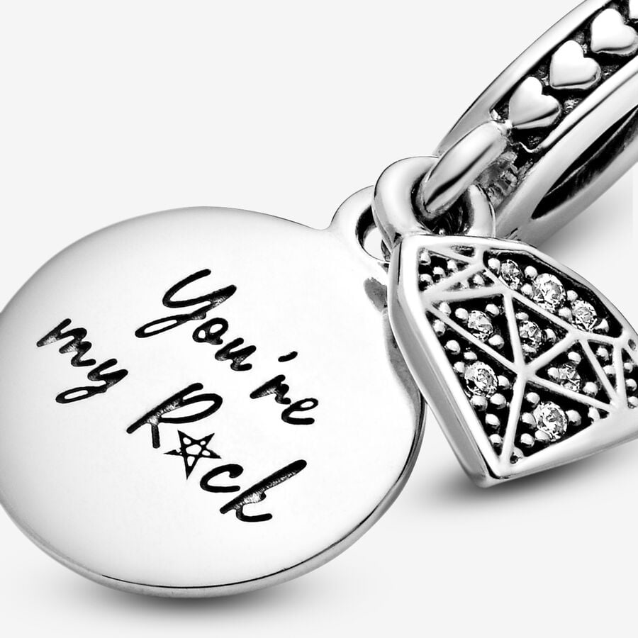 Express gratitude to a cherished individual for their steadfast support with this sterling silver pendant charm bearing the inscription "You're my rock." Enhanced with a diamond-shaped adornment adorned with shimmering stones, it radiates elegance and appreciation.